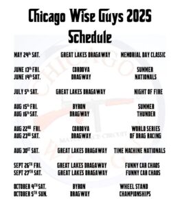 Pete Demos, President of The Chicago Wise Guys, started this racing organization in 1995. We are headed into our 31st year in 2025. This team has grown larger and faster over the years, thanks to all the support of you fans coming out to the track to watch one of the best forms of match racing and circuit drag racing. All the drivers and pit crew members and everyone involved is an advantage to our organization, we strive each year to be the best we can and give the fans the “best of the best” match circuit drag racing possible. Once again thanks for your support.