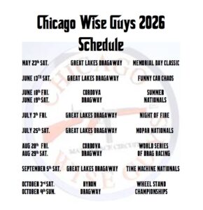 Pete Demos, President of The Chicago Wise Guys, started this racing organization in 1995. We are headed into our 32nd year in 2026. This team has grown larger and faster over the years, thanks to all the support of you fans coming out to the track to watch one of the best forms of match racing and circuit drag racing. All the drivers and pit crew members and everyone involved is an advantage to our organization, we strive each year to be the best we can and give the fans the “best of the best” match circuit drag racing possible. Once again thanks for your support.